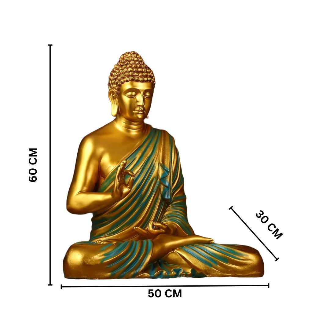 Crafted from premium-quality materials, the statue exhibits intricate details — from the textured curls on the head to the graceful drapery of the robes. The serene expression on Buddha’s face, with one hand raised in the Abhaya Mudra and the other resting on the lap, exudes a calming presence, perfect for enhancing the spiritual energy in your home or office.