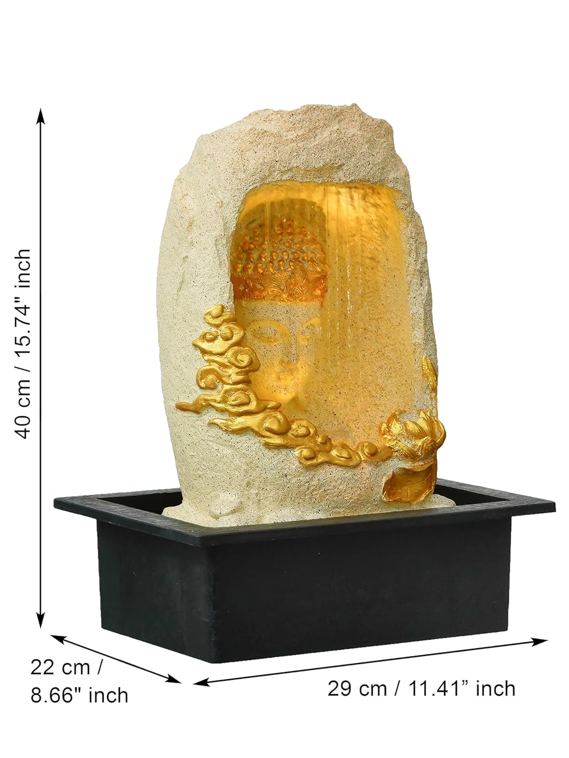 Transform your home into a peaceful retreat with the CRAFTVOGUE Buddha Tabletop Water Fountain. Crafted from premium polyresin, this elegant indoor fountain features a meditating Buddha in a cave-style design with a rustic stone-textured frame. Adorned with intricate lotus and cloud motifs, the fountain is illuminated by warm LED lights that cast a golden glow through the cascading water.